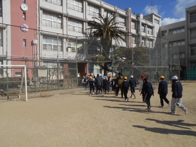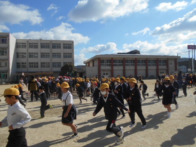 休み時間中に、地震発生、津波警報の発令がなされた想定で避難訓練を行いました。