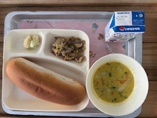 昨日の献立は「豚肉のカレー風味焼き・コーンスープ・カリフラワーのピクルス・コッペパン・バター・牛乳」です。