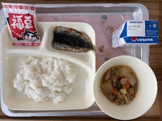 今日は節分の行事献立で、「いわしのしょうがじょうゆかけ・含め煮・いり大豆・ごはん・牛乳」です。