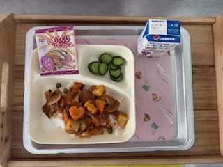 6日は「ハヤシライス・きゅうりのバジル風味サラダ・いもけんぴフィッシュ・牛乳」です。