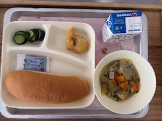 今日9日は「白身魚フリッター・スープ煮・きゅうりのピクルス・コッペパン・ブルーベリージャム・牛乳」です。