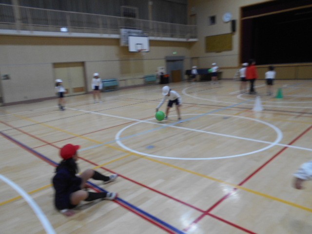 体育「フロアボール」床で行うバレーボールのような運動です。