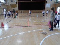 2年生の様子 体育「大縄跳び」 八の字跳びの練習です。