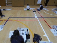 4年生の様子「書き初め」 「明るい心」を題に講堂で書き初めをしていま...
