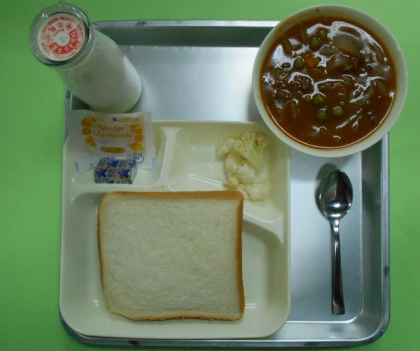 今日の献立は、食パン、マーマレード、ビーフシチュー、カリフラワーのサラダ、固形...