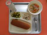 今日の献立は、ライ麦パン、鶏肉のガーリック風味焼き、スープ煮、きゅうりとコーン...