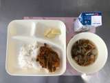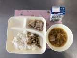 献立は「鶏肉のゆず塩焼き・ソーキ汁・ツナ大豆そぼろ・ごはん・牛乳」です。 ソーキ...