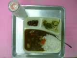 今日の献立は、ビーフカレーライス、グリーンサラダ、うずら豆のグラッセ、牛乳です...