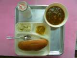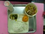 今日の献立は、レーズンパン、豚肉と野菜のカレー煮、かわりピザ、カリフラワーのピ...