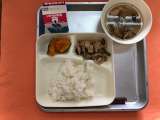 今日の献立は、「ごはん・牛乳・豚肉と干しずいきのみそ煮・すまし汁・焼きかぼちゃ」...