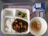 献立は「冬野菜のカレーライス・ブロッコリーとコーンのサラダ・黄桃(カット缶)・牛...