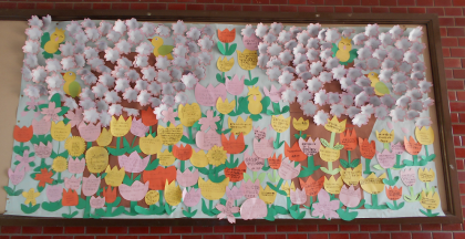 玄関の掲示板は、6年生が1年間のめあてを書いています。