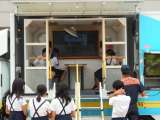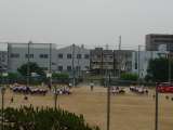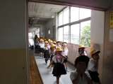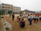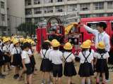 訓練ですが、運動場には消防車がいます。子どもたちは、真剣な表情です。