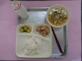 今日の献立は、ご飯、さけの味噌風味焼き、すまし汁、白玉の抹茶ソースかけ、牛乳で...