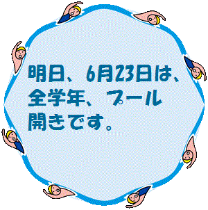 明日、6月23日(木)は、プール開きです。 1時限目は4年生、2時限目は2年...