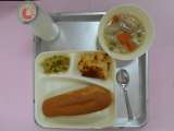 今日の献立は、ライ麦パン、鶏肉と野菜のスープ煮、カレーソテー、りんごのクラフテ...