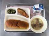 献立は「サーモンフライ・豆乳スープ・きゅうりのバジル風味サラダ・パンプキンパン・...