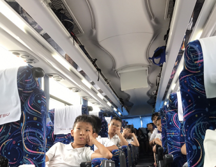 子どもたちはバスの中でアニメのDVDを見ています。