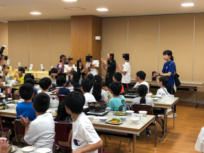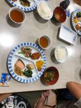 朝食(洋食)。食事係があいさつをしています。しっかりと食べて今日も元気に活動しま...