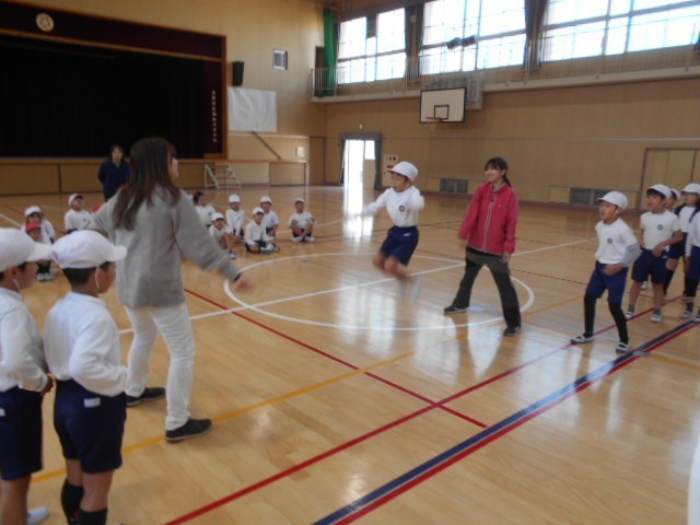 2年生「体育」大縄とびで八の字の練習です。3年生「図工」絵の具で描いた模様をコン...