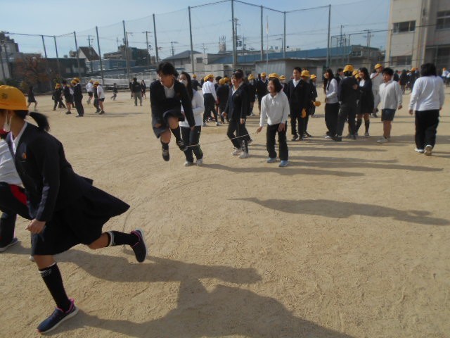 耐寒大縄跳び 全校児童が運動場に出て大縄跳びをしています。