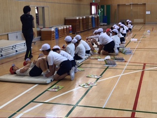 外の種目に引き続き、体育館で上体起こし、反復横跳び、握力、長座体前屈の測定を行いました。