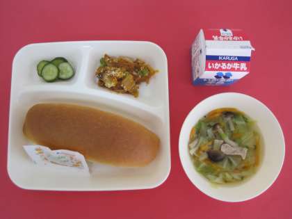 鶏肉、キャベツ、にんじん、パセリを使ったスープときゅうりのピク