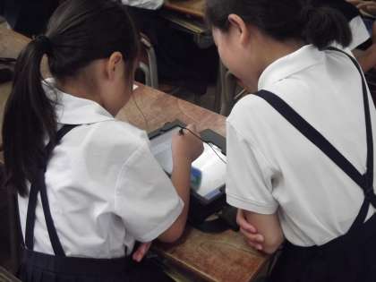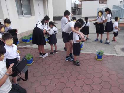 晴れ渡る天気の中、6年生のお兄さんお姉さんがタブレットの使い方を教えてくれました。