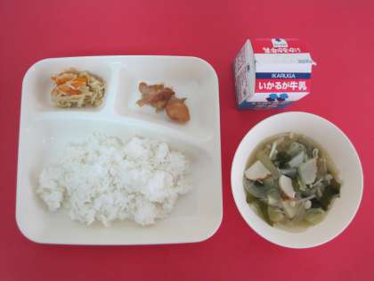 かまぼこ、キャベツ、たまねぎ、えのきたけ、わかめを使った五目汁と
