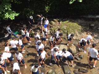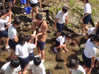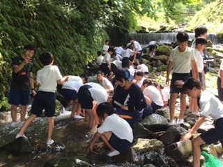 1組が、先に魚つかみを、2組が焼き板みがきをしています。