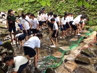 今度は、1組が焼き板みがきを、2組が魚つかみをしています。