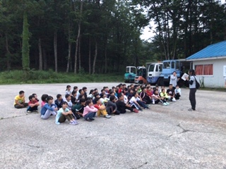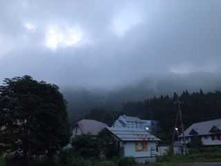 夕飯を食べて、いよいよナイトハイクが始まります。山も霧がかかって、少し薄気味悪い感じです。校長先生のお話が終わるといよいよスタートです。
