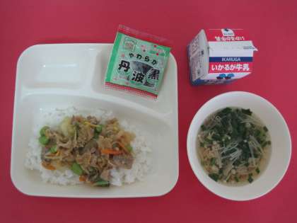 鶏肉、もやし、にら、えのきたけを使ったスープとソフト黒豆です。
