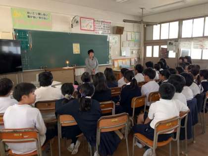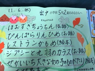 5年生の国語は「注文の多い料理店」を学習しているので、情景や登場人物をイメージしたりしていますが、授業で自分で黙々と読むのと、読んでもらうのとでは、感じ方が違うようで、終わってからは、「良かった」「楽しかった」という感想が聞こえてきていました。