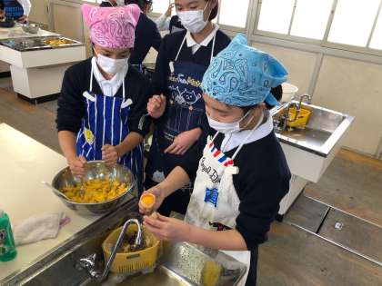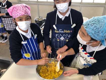 ゆで終わったあと、砂糖と卵黄を混ぜて形をつくりフライパンで焼きました。