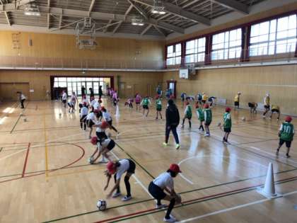 前半は、説明などを聞いた後に、パスの練習やドリブルの練習などをしました。