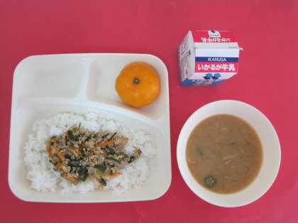 季節のオクラを使ったみそ汁と冷凍みかんです。