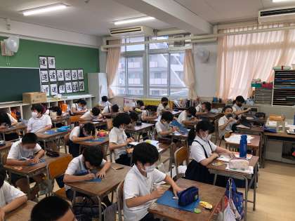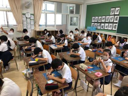 ラーメンのふたを使って、「ほんものそっくり」の学習をしています。画用紙の上にカーボン紙、ラーメンのふたを置いて、ふたをなぞっているところです。