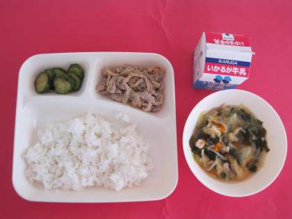 鶏肉、うすあげ、キャベツ、にんじん、えのきたけ、わかめを使った五目汁とゆでたきゅうりを粉末のかつおぶしを使ったたれで和えた和え物です。