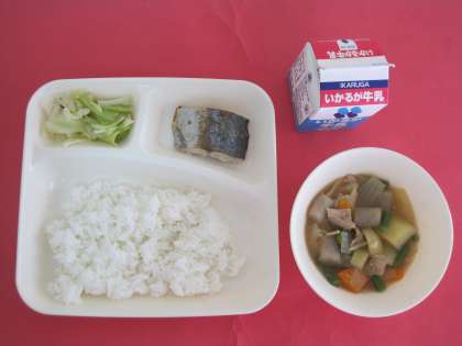 豚肉、じゃがいも、つなこんにゃく、たまねぎ、にんじん、さんどまめを使った煮ものと茹でたキャベツを梅肉を使ったたれであえた和え物です。