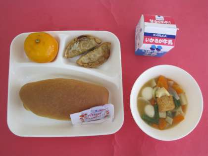 鶏肉、うずら卵、あつあげ、たまねぎ、たけのこ、にんじん、さんどまめを使った中華煮です。うずら卵にアレルギーのある児童は、うずら卵を入れる前に取り分けたものを食べました。それと冷凍みかんです。