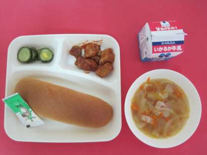 ベーコン、じゃがいも、たまねぎ、にんじん、パセリを使ったスープときゅうりとコーンをゆでて、ゆずを使ったドレッシングであえたサラダです。