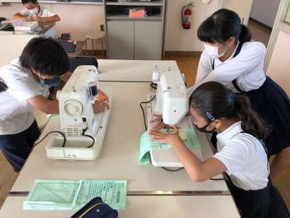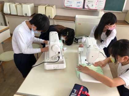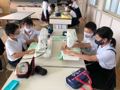 ミシンを使って練習布の縫い方を練習しました。前回の授業で、ミシンに上糸や下糸をセットする方法を学習しました。今回はミシンの縫い方の特徴を学習しました。