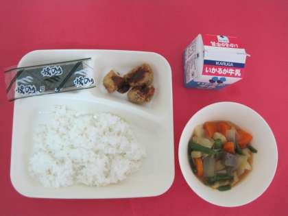 じゃがいも、こんにゃく、たまねぎ、たけのこ、にんじん、さんどまめを使った煮ものと焼きのりです。