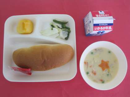 鶏肉、ベーコン、じゃがいも、たまねぎ、スイートコーン(クリーム缶)、にんじん、コーン、グリンピースを使ったクリームシチューです。水溶き上新粉でとろみをつけています。