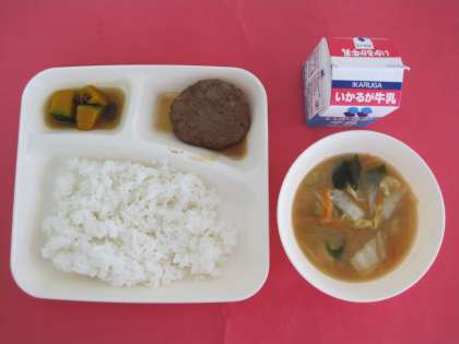 とうふ、たまねぎ、はくさい、にんじん、わかめを使ったみそ汁とかぼちゃとあずきを一緒に煮たいとこ煮です。