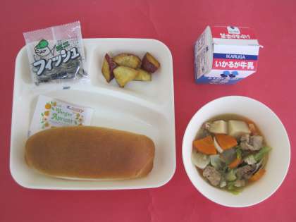 乱切りにしたさつまいもを油で揚げ、砂糖、塩、濃口しょうゆで作ったみつをからめた大学いもとミニフッシュです。