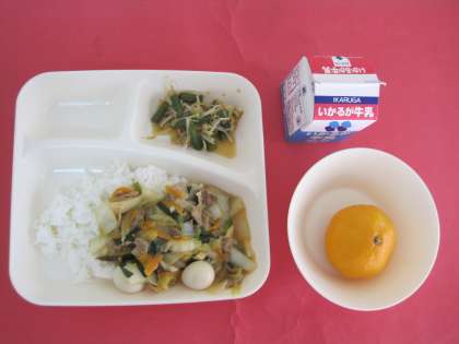 豚肉、うずら卵、はくさい、たまねぎ、たけのこ、にんじん、にら、しいたけを使った中華丼です。うずら卵にアレルギーのある児童は、うずら卵を入れる前に取り分けたものを食べました。
