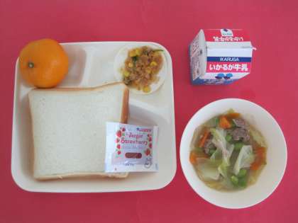 ぎょうざの皮の上に、缶詰のツナ、コーン、ピーマン、細切りチーズをピザソースで味つけしたものを乗せて焼いた変わりピザと季節のみかんです。