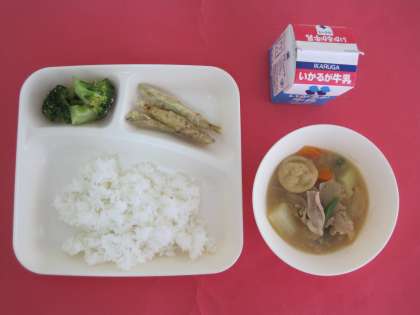 豚肉、一口がんも、じゃがいも、だいこん、たまねぎ、にんじん、さんどまめを使った和風の煮ものと季節のブロッコリーのごまあえです。